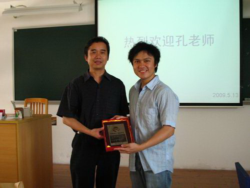 孔老师语言风趣幽默,展示了社工人特有的热情和开放,整个交流分享会气氛十分活跃,笑声不断,交流分享会于上午11点结束。最后,社工班学生代表给远道而来的孔老师和梁老师赠送礼物以示感谢。