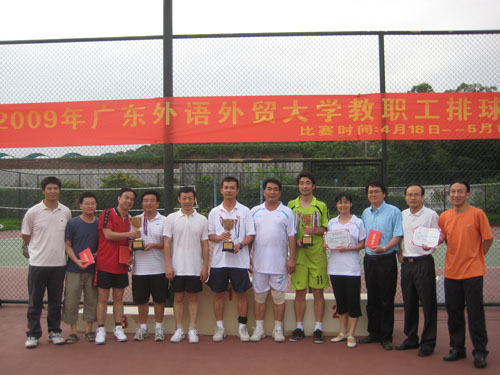 本网讯 5月10日下午3点半至6点,伟德bv国际体育2009年度教职工排球赛在北校区排球赛举行。进入决赛的商英学院、法学院和信息学院等8支代表队参与角逐,最终体育部一举夺得一等奖,继教(公开)学院和商英学院代表队分获二、三等奖。比赛结束后,校党委副书记许国彬为获奖的教职工代表队颁发了奖杯和获奖证书。