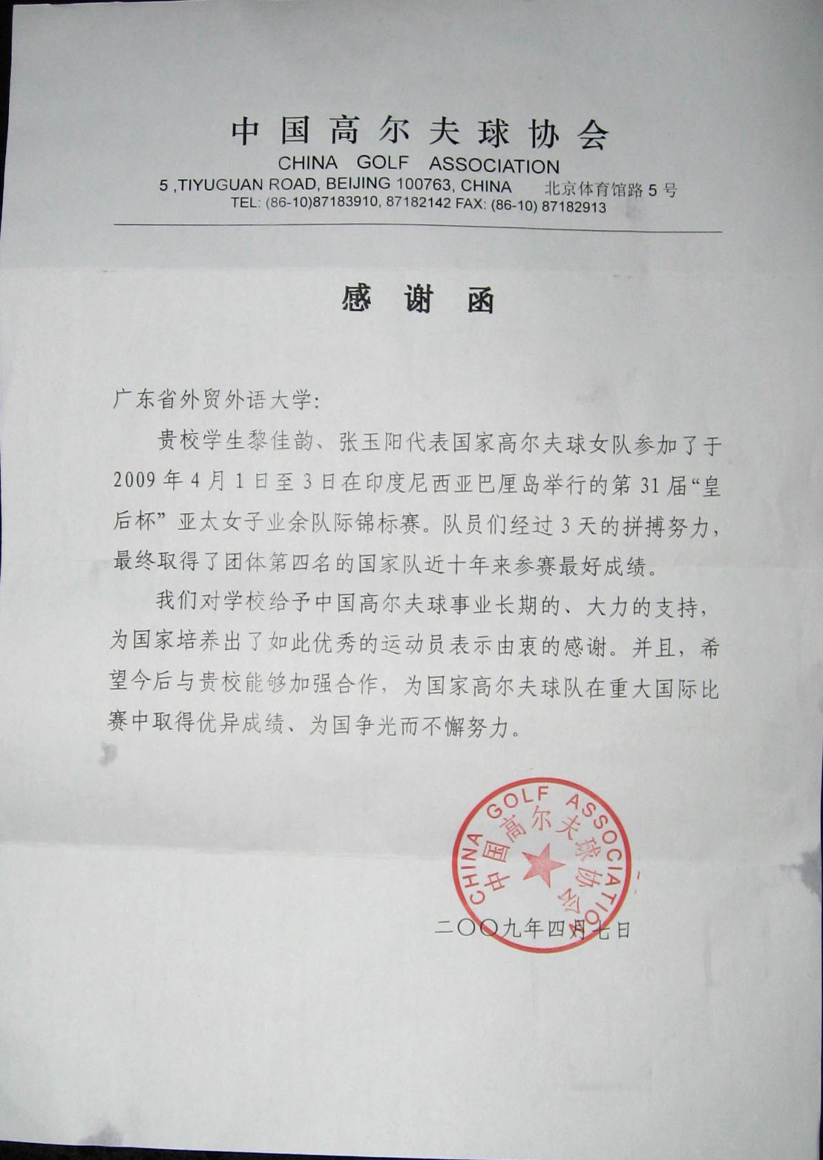 中国高尔夫协会致伟德bv国际体育的感谢函