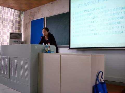 随后,郝建萍从三个大方面对学生工作基本情况做了简明扼要的介绍。一是学院学生及学生工作队伍基本情况介绍;二是学院学生工作基本情况介绍;第三,构建学校教育,家庭教育,社会教育和学生自我教育协调发展的工作新机制。