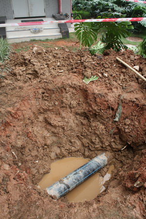 记者在11栋水管破裂现场看到,该栋楼下的草地已被挖开了一个大坑,坑里的水管还在滴水。据大众物业机电维修部余部长介绍,今天早上6点左右水管出现破裂,涌上来的水将11栋楼下部分草坪淹没,工作人员只好将11、13两栋宿舍的供水阀门关闭以便维修。
