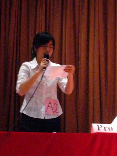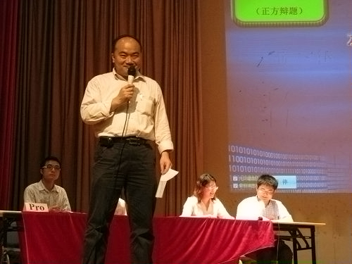 决赛从开始就进入了白热化阶段。经过第一轮的热身,两支队伍都调整到了最佳状态。0pening speech中,正方代表storm一辩从保证学生的学习时间和养成良好的作息规律出发,认为夜晚断网十分必要;反方代表lightening的一辩则指出,保持网络畅通可以延长学生学习时间,方便毕业生找工作,并为与外国朋友交流提供便利。双方各执一词,互不相让。