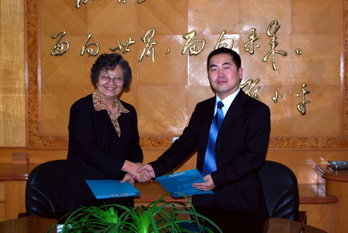 本网讯 2009年4月1日下午,中文学院党委书记蒙德红、副院长陈彦辉、党委副书记周秀娇、辅导员王迪到顺德碧桂园与广东碧桂园学校签订了对外汉语专业实习基地合作协议书。碧桂园学校的徐副校长和杨主任出席了签订仪式。