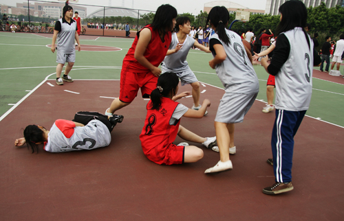 接下来的比赛经贸学院有惊无险地战胜了教育学院。两队前三节一度打得难解难分,分差仅为1分。比赛的转机出现在第四节。凭借16号刘嘉允断球后上篮以19:17领先,此时,前三节拿下6分的教育核心队员5号黄馨莹在进攻中不慎抽筋。她身边的经贸7号简碧仪为她进行有效的按摩。