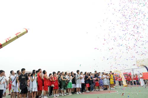 校学生会工作人员在开幕式现场用黄色和白色的气球搭建了一道被称为“凯旋门”的拱门,门前摆了一块红色的“英雄榜”。开幕式一开始,政管学院、经贸学院、艺术学院、信息学院、新闻学院、法学院、教育学院、管理学院的男女各8支代表队依次走过了“凯旋门”,各学院代表在“凯旋门”前的红色“英雄榜”上签名。随后何越晖致开幕辞,并在英雄榜上签名。裁判员代表杨钱亮、运动员代表罗廷光也先后经“凯旋门”到英雄榜上签名,并进行了宣誓。“嘭”“嘭”两声,礼炮响起,“广外杯”篮球赛正式开幕。首战前,在一号球场举行了开球仪式,蔡德亮为本届比赛开球。接着,比赛正式打响。