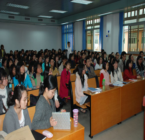 讲座开始, 朱敬文女士简明扼要的介绍了联合国机构的组成及职位分配。接着,她谈到了笔译与口译的特点以及作为联合国的一名翻译所面临的挑战与机遇。“作为一名口译,其所面临的压力主要来源于联合国的时限所导致的发言人讲话速度的提高。而作为一名笔译,与组员的合作是必不可少的。”在讲到在联合国翻译服务所面临的机遇时,她介绍了在联合国从事翻译服务的各种优厚待遇,如节假日、子女教育津贴、健康保险以及退休金的发放等,引得了在座学生的阵阵掌声和喝彩。