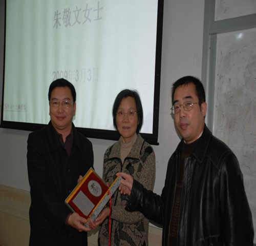 讲座结束后,口译系主任王丹老师对讲座做了简要的总结,随后余东和梁学宏一起为朱敬文女士赠送礼品并合影留念。