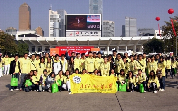 上午8点,队伍统一穿着黄色长袖T恤,从广外大学城校区乘校车前往天河体育中心。到达体育中心南广场后,各路队伍的方阵迅速集中起来形成一个10列,每列18个方队的大方阵准备起步仪式。