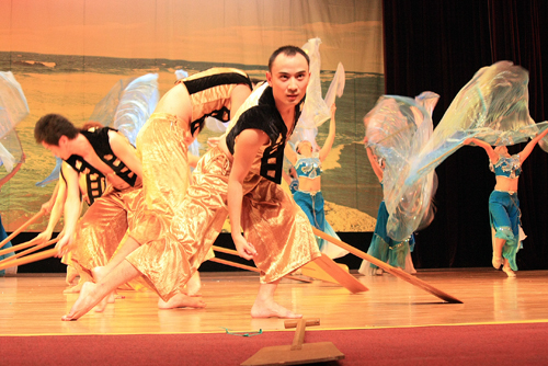 晚会最后,校艺术团以舞蹈《珠江涌潮》展现珠江人民的热烈情怀以及对未来的憧憬。珠江女子柔若水波,在阳光的照耀下欢快起舞;珠江男子手执船桨,在水波之间起伏划行,当大浪涌来,珠江男子们显现的是更昂扬的斗志。最后,女子们张开双翅,飞向明天,男子们注目远望,奔向未来,为本次演出落下了完美的帷幕。