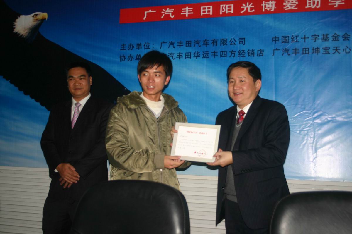 据悉,“博爱助学金计划”由中国红十字基金会发起,募集社会各界资金,帮助贫困大学生完成学业,本次助学金由广汽丰田公司捐助80万元人民币,用于资助伟德bv国际体育,BETVICTOR官网、武汉理工大学、四川大学、湖南大学四所高校的80名贫困大学生(每所高校资助20名)。