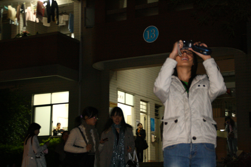 其中,六栋宿舍楼更是出现“万人空巷”的情景。许多同学冲出宿舍,手拿相机拍下这一罕见的天文景观;六栋楼下的空地更是被黑压压的人群所覆盖,尖叫声,笑声此起彼伏,还不断有过往的路人加入观星的行列。一时之间,笑声与叫声交织,闪光灯与星光竞亮。