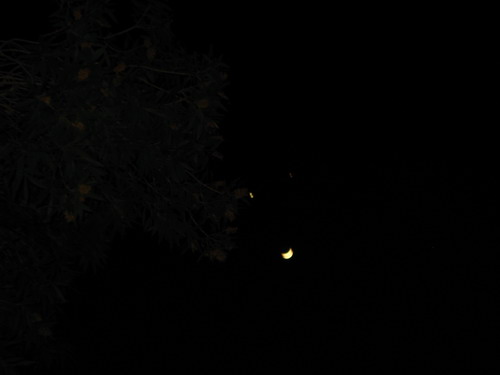 晚上6时许,夜空上惊现双星伴月奇观:夜空上,两颗明亮的星星一左一右,宛若一双顽皮的眼睛,而它们的下方,一弯月牙不偏不倚,俨然一张可爱的孩童笑脸,在黑夜的映衬下明亮动人。如此难得一见的奇观顿时在校园各处掀起一阵热潮,各人争相观看,不少人都掏出相机拍下这奇景。