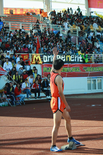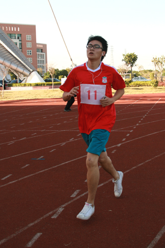 在男子1500m比赛中,有个选手穿着印有大大的“11号”和“BOOK”标志的“红色战衣”,一边听mp3一边跑步,姿态十分轻松。他就是来自国际学院大一新生陈书。