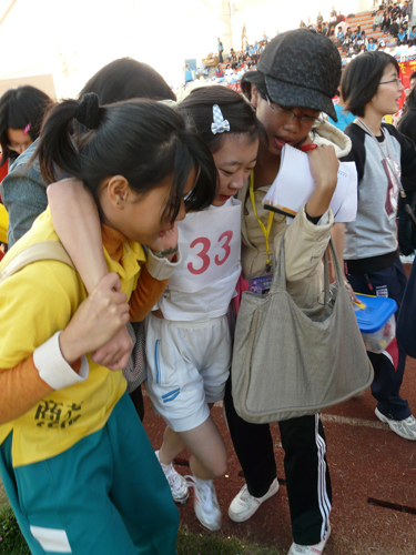 赛场终点处总有一群身着蓝色马甲的拉拉队,他们就是来自继续教育(公开)学院的后援队。场上拉拉队热情加油,观众席上的后勤工作人员也组织有序,细心的检查急救箱等医药用品。为了参加校运会,他们早晨更是六点集中从大朗赶来,正如该学院团委副书记谭溪同学所说,虽然去年其学院取得了第三名的骄人成绩,但一切周到的后勤都只是想让运动员有一种归属感,运动员尽力而为就好。