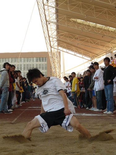 上午的男子跳远比赛中,因诸多选手前三跳均告失误,竞争早早地便在上届季军信息学院选手芦国勇和公开学院大一新生冼文浩之间展开。冼文浩第二、三跳均跳出6米10的全场最佳成绩,稳稳的落地更是赢得喝彩声一片。芦国勇则在最后一跳中发挥失常,丢掉超越的最后机会,以6米04的成绩屈居亚军,国际学院选手陈嘉亮获得第三。