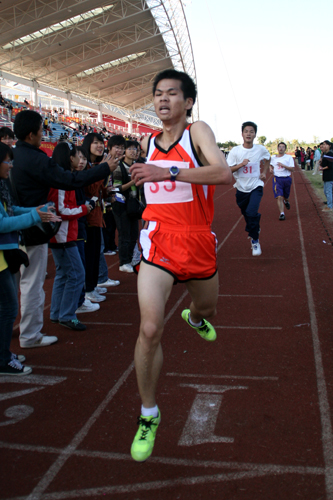 下午2点15分开始男子5000米比赛,比赛中选手们你追我赶,频繁上演反超好戏。最终,上届校运会亚军、法学院选手吴国威凭借着在第二组比赛中的稳定发挥,以18分00秒96勇夺冠军,为自己学院赢得了一枚宝贵的金牌。