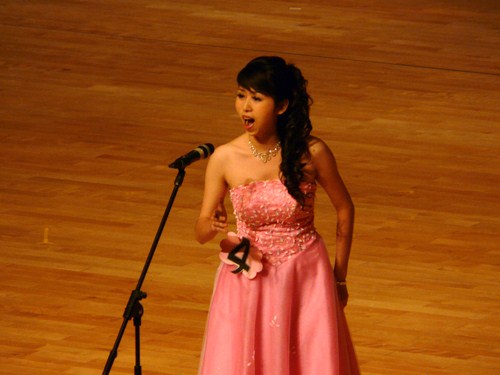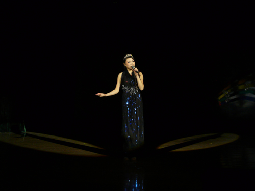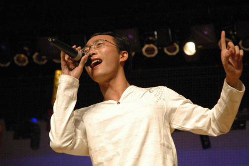 专业选手引吭高歌,原创歌手才华横溢 专业组比赛竞争更是激烈,五位来自艺术学院的选手实例超群,不分伯仲。01号陈立夫浑厚低沉的歌声充满磁性,极富专业水准;金色的礼服、响亮的声音,02号洪英丹一曲《山里的女人喊太阳》激情四溢;03号袁小香凭借高超的演唱技巧,充沛的感情征服了评委和观众,《断桥遗梦》凄美感人,一举摘得专业组金奖;04号谢驰演唱的《沁园春雪》大气磅礴,富有穿透力。