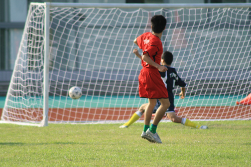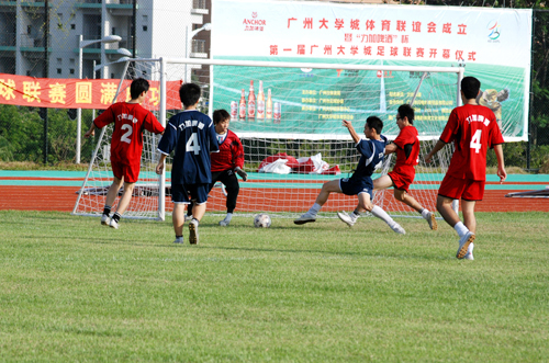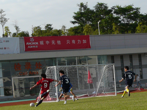 换人调整后,场上形势便发生巨大变化。第39分钟,广外明星队5号叶志刚右路带球突破,往左路一记斜长传,皮球却朝球门飞去,华师队门将曾剑锋出击时与己队后卫相撞没能控制住球,皮球不偏不倚地落到了广外前插的10号朱文洪脚上,他带球扣过一名防守队员,冷静地将球送入空门,1:0!广外明星队取得领先。