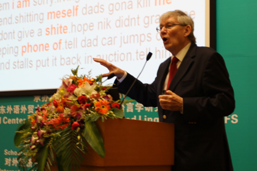 研讨会现场气氛热烈,进行提问环节时,一位学者分享了他的经历。他说:“我曾经盗用我妻子的QQ和她的朋友聊天,一直未曾被识穿身份。”Malcolm Coulthard说,这就从另一个方面说明了语言学应用的重要性。假如对方曾经留意过他的妻子的话语方式,那就不会发生这样的事情了。