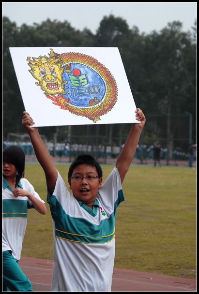 本届外校运动会最大的亮点是,每个参与的班级都展示了本班独特的班徽。各个班的班徽制作精美、构思巧妙。不少班级在班徽设计中融入了动漫元素,有的体现了奥运精神,有的表达了“龙的传人”的概念,还有的围绕本班班名进行设计,花样迭出。