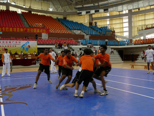 广州体育职业技术学院中专班的同学们首先为同学们献上了中国民间游戏“老鹰抓小鸡”,带动了全场观众的气氛。卡巴迪就是印度版的“老鹰抓小鸡”。