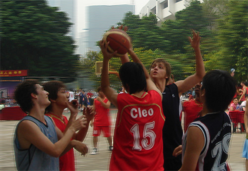 篮球场上,我方队员与暨南大学一队(红色)争抢篮板