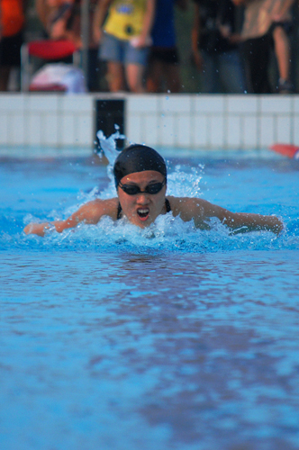 与田径比赛不同,游泳比赛中有的是飞溅的水花,运动员划水时发出的水声。男子50米蝶泳比赛中,经贸学院的宋剑浩、黄胜杰与管理学院的庄俊毅三人在水花四溅的泳池中一直齐头并进,你追我赶,冲刺时刻几乎同时触壁。最后,庄俊毅以微弱的优势夺得第一。