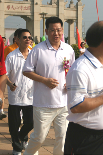 起跑开始,牌坊前面打响了礼炮,领跑的是上届奥运会男子双人跳水10米台冠军杨景辉,领导们则作为先锋跑在队伍前列,他们神采奕奕,以自身的行动鼓励着广大青少年进行体育锻炼。