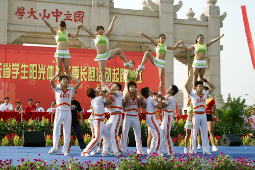 起跑活动在8:40正式开始,首先由广州体育学院健美操表演队带来韵律十足的《动感组合》。队员们高难度的动作,协调无间的配合赢得现场的热烈掌声。表演糅合了各种运动元素,现代感与美感的结合、刚韧与柔美的转换,充分展现了运动之美。接着,广州体育学院啦啦操代表队的《冠军》又让在场观众享受了一次“视觉冲击”,托举、抛接、前后空翻等高难度动作的完美完成将现场的气氛推向了高潮。