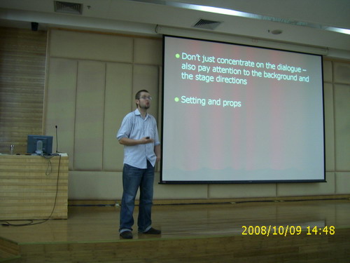在主持人简短而流利的全英开场白之后,Duncan轻松切入主题,为大家介绍“What drama actually is”。他引用莎士比亚的例子说道,一部成功的戏剧不仅仅是写在纸上的,更重要的是要能表演出来。因此表演者必须懂得戏剧是什么、应该怎样演好一部戏剧。