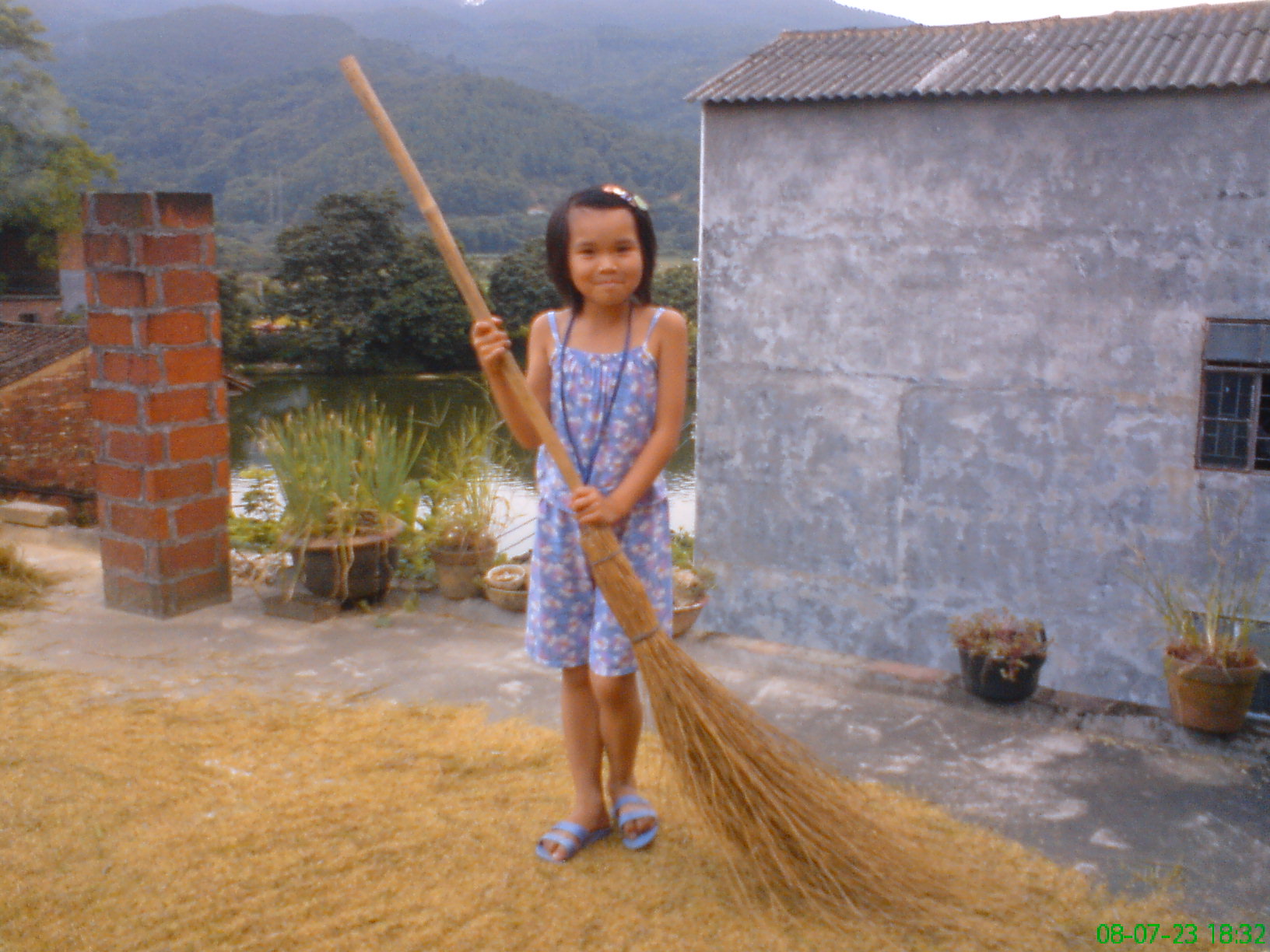 小怡常常帮亲人收稻谷。小怡拿起一个木扒,在那一滩稻谷上来回把杂草扒成一堆,放到角落里,又拿起一个扫帚,把稻谷从四周向中间扫,堆得像小山一样,再拿起铁簸箕铲把稻谷铲进麻袋里,妹妹也在一旁熟练地帮着忙。收完后,两姐妹把一袋袋的稻谷搬回屋里放着。她们有干劲、动作麻利,与城市里常常抱怨家务活繁重的孩子大相径庭。