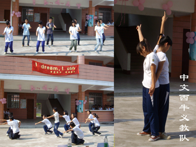 由学生表演的“体育串烧”则将文艺汇演带入另一个高潮。其中有刚劲有力的武术表演、柔中带刚的太极及动感十足的健美操。学生结合体育课所学,精彩展示了义教队的体育教学成果。此外,文艺汇演的节目还有学生表演的双人合唱,小品《公德心》、《校园求职录》、歌曲《感恩的心》,义教老师上演的“八语连唱”等,节目各具特色,精彩纷呈。