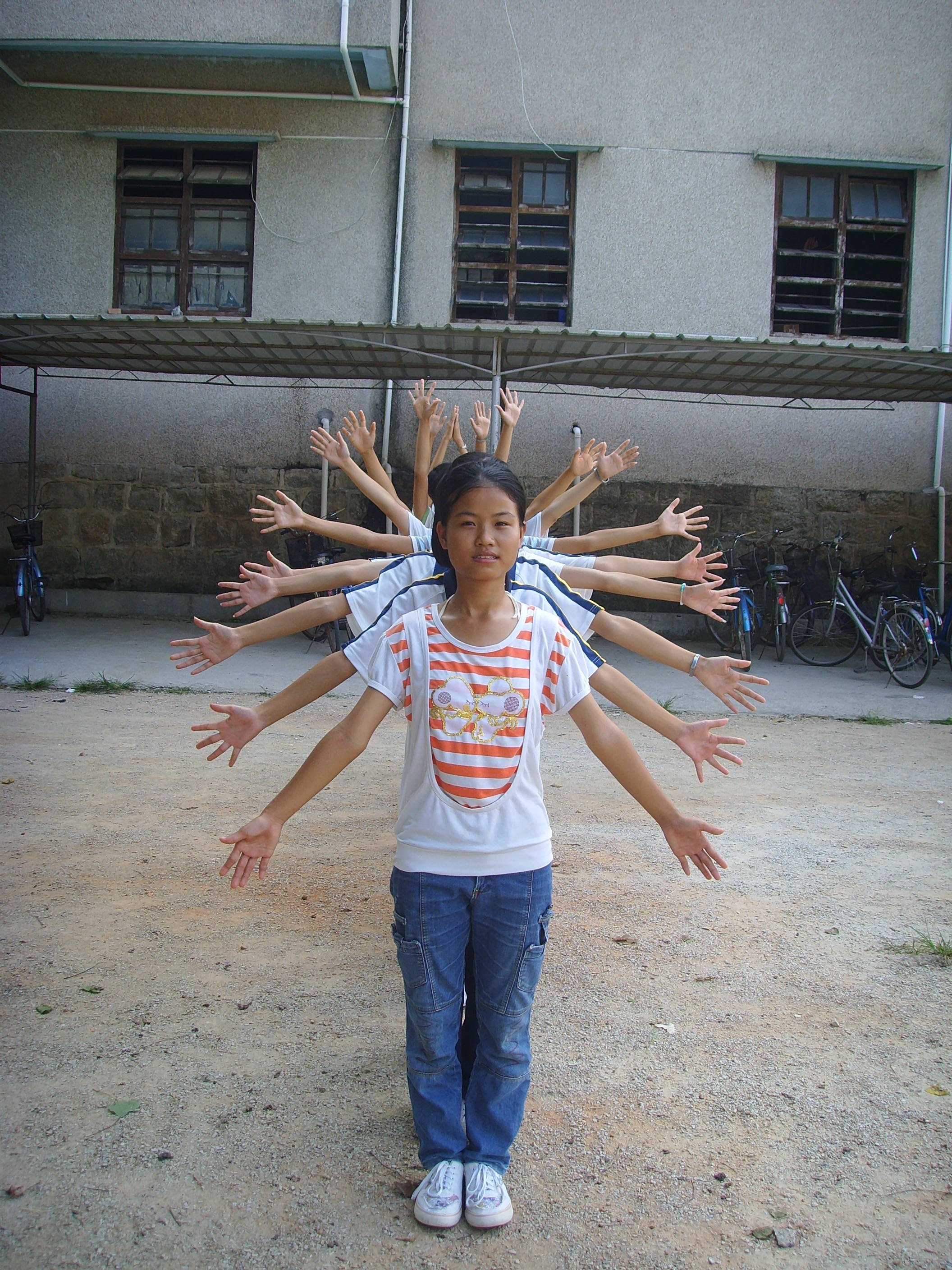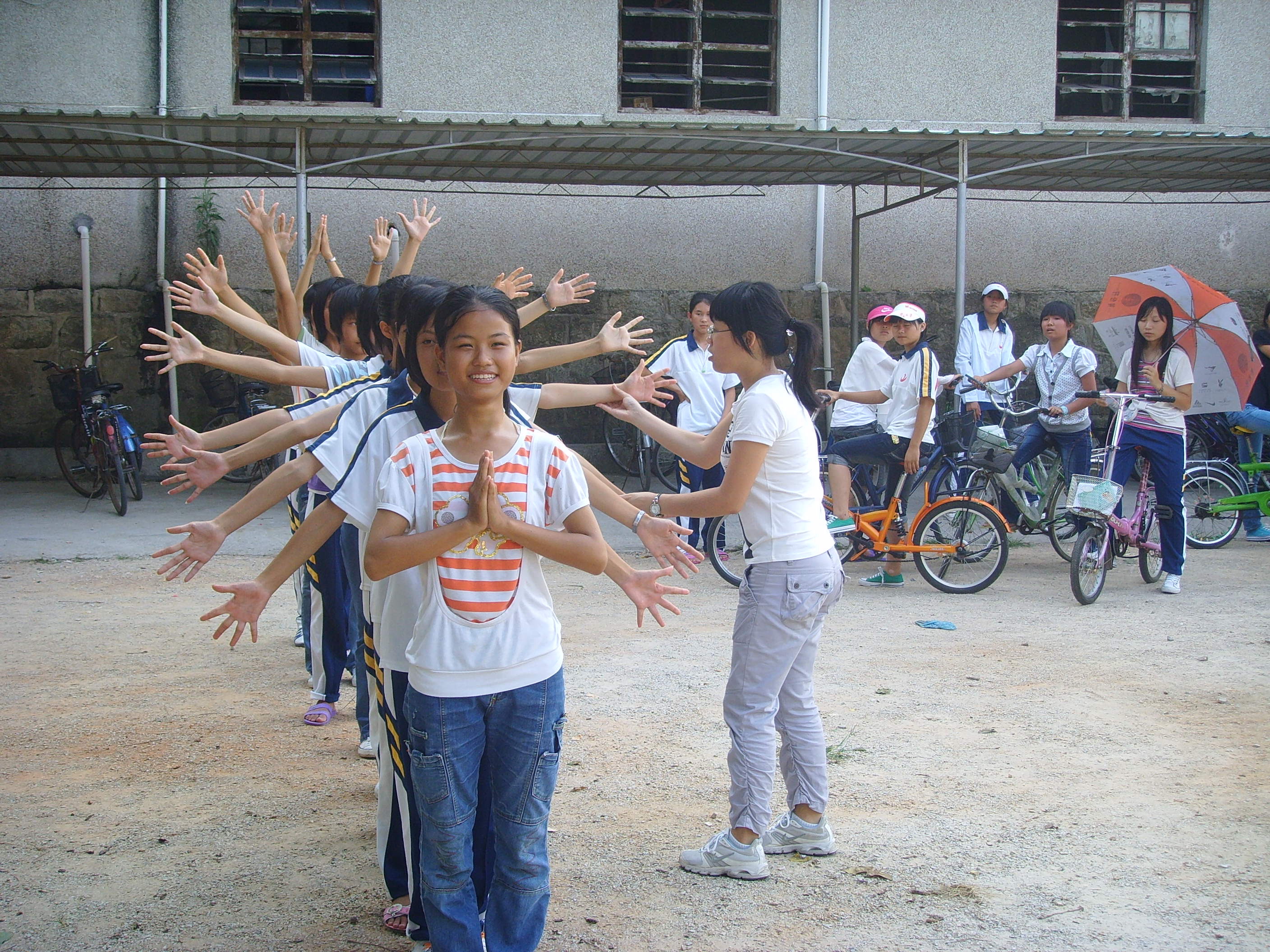 负责舞蹈编排的陈诗敏,在节目的开头,加插了“千手观音”这一动作表演。学生按照从低到高的顺序,排列成一直线,伴着节奏,逐个地伸出手起舞,路过的学生纷纷驻足观看。