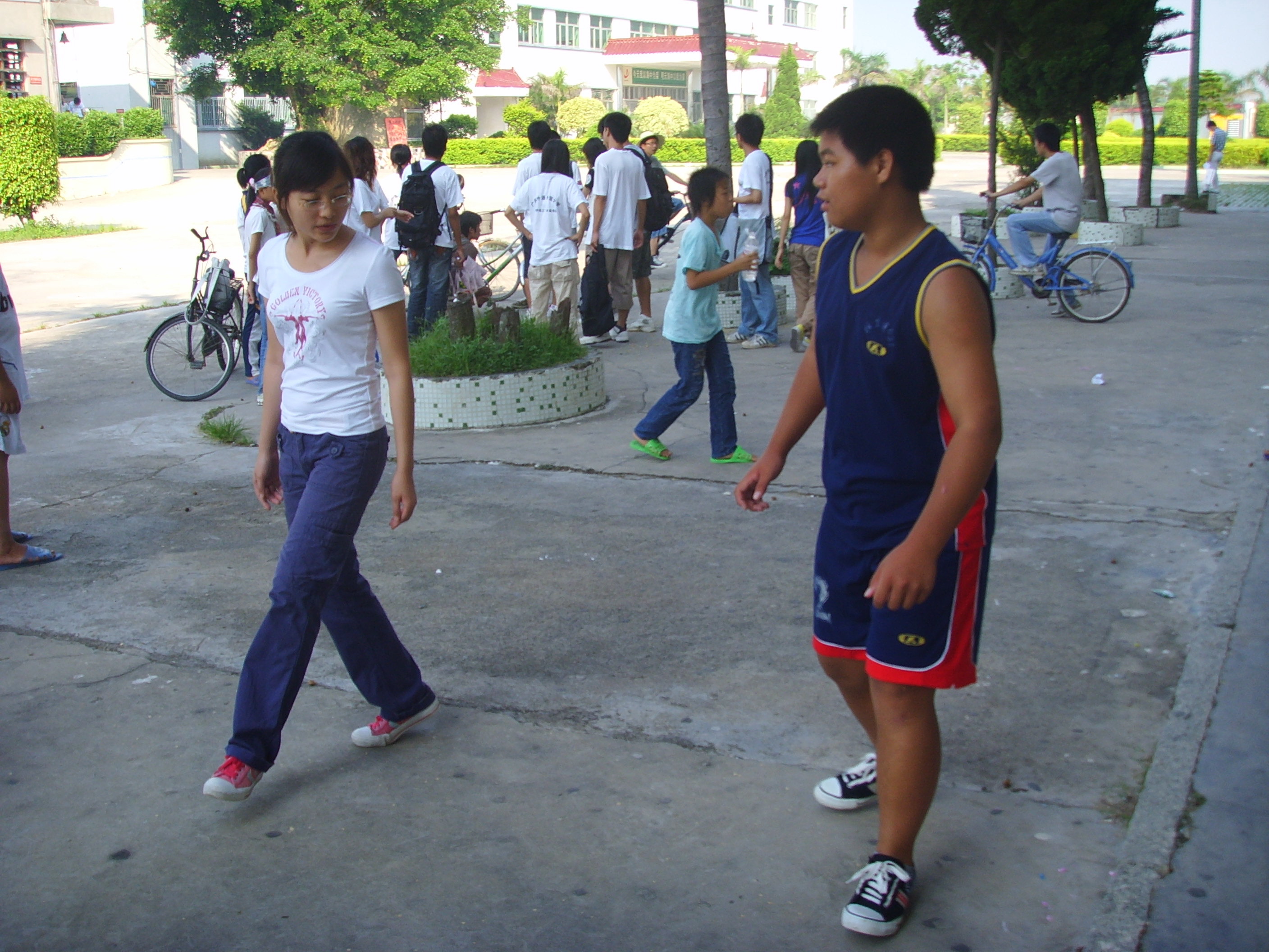 每天早上六点半左右,初一2班的11名女生,便已早早地来到学校,跟着老师练习健美操。在22日的友谊篮球赛上,她们凭短短一分多钟的中场表演崭露头角,同学们不断喝彩赞叹。在晚会上,她们将会用around the world 为伴奏,跳健美操,长达3分多钟。从动作的准确到位、到队形的变换,再到节奏的配合,她们丝毫不马虎,反复练习。