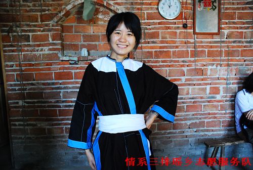在学生家里,许多义教队员都对瑶族独特的服装非常感兴趣。热情好客的瑶族村民便让好奇的义教队员试穿漂亮的瑶服。传统的瑶族服装有一件深色的上衣,在领口和袖口处绣有漂亮的图案或铃铛,女生系一条白色的腰带,男生则系红色腰带。这次家访中义教队员就兴致勃勃地当了回“瑶哥瑶妹”。