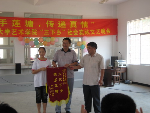演出正式开始前,莲塘村委和莲塘小学为表达对扬艺服务队的感激,共同制作了一面印有“文化下乡,情系莲塘”的锦旗赠送给扬艺服务队,队长林延庆代表服务队接受了锦旗。艺术学院团总支书记曾继平也回赠了礼品,以表达对莲塘村委和莲塘小学的感谢。