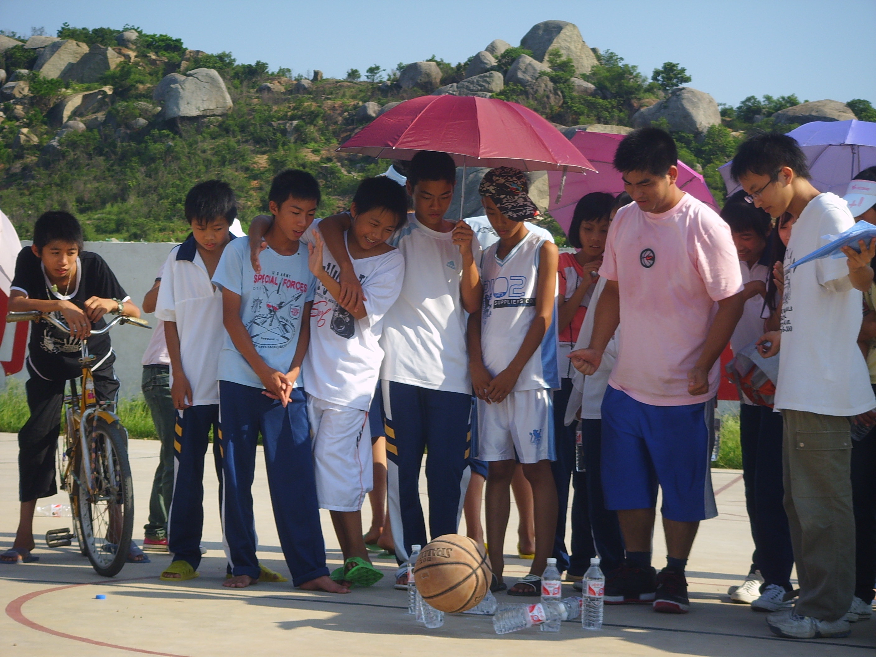 操场上,队员们仿造了三条保龄球道:用一瓶瓶矿泉水来替代保龄球瓶,以篮球作为保龄球。学生每组10人,不限时间,推倒最多瓶子的一组为胜。刚开始时,大家都还没习惯,篮球推出去后,总会在途中滑到一旁,瓶子一个都不倒。第一轮表现平平。然而,经过老师的一番提点后,聪慧的学生马上掌握要领,在第二轮里表现突飞猛进。2班同学进步最大,从原来的0.8分,到最后共得5.1分。