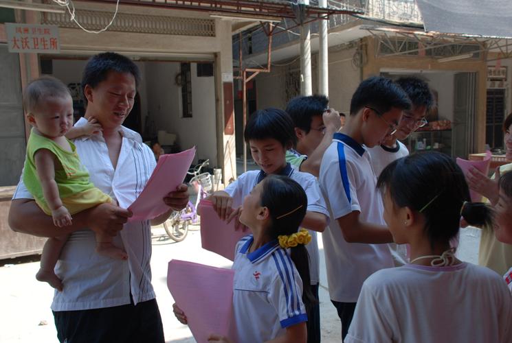 各种写有生活小窍门,健康安全常识以及奥运等知识的传单,随着两队队员们走街串巷,一一下发到村民的手中,不少村民拿着宣传单前来问询,还有许多小学生前来热心帮助宣传。