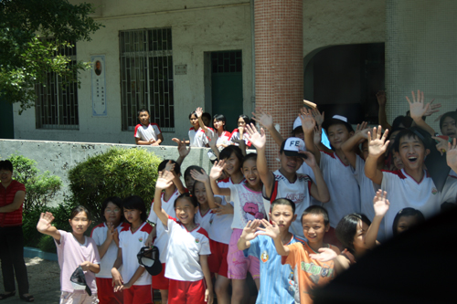 服务队队员上车离开,孩子们在车后不停挥手,车里则有队员们不断回望的目光。