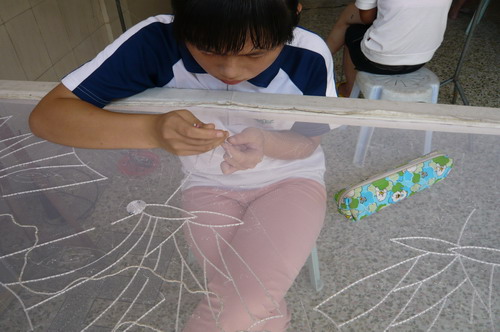 学生晓林告诉队员们,海山镇每户居民都擅长刺绣。刺绣成本低,每幅刺绣的手工成本只需7到8元人民币,但是市场卖价却上百元。刺绣手工业存在很大的利润空间。若能把旅游业跟手工业结合起来,将会带动这个小镇的经济进一步发展。