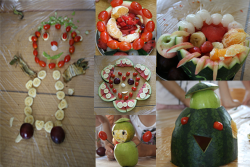薪火相传队员将学生带回教室,在围好的桌子旁坐成一圈,准备对派发下来的各种各样的水果进行大拼盘。有西瓜、布林、梨、香蕉、荔枝、圣女果等水果,同学们要充分利用自己的想象能力将有限的水果拼出一个有特色又好看的拼盘。