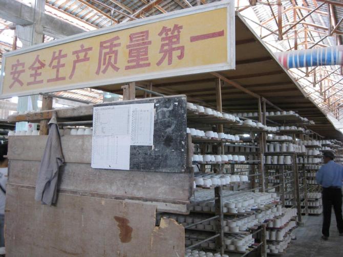 为了让队员们更深入更清楚地了解这些瓷杯的制作过程,三位领导带领着队员们一一参观了各个工序的产地,向队员们详细介绍了瓷杯的制作工序,并耐心地解答了队员们提出的疑问。在这几个车间里,队员们对陶瓷业龙头企业的由一块泥巴到一个出口到欧美的精美瓷器所经历的十七道复杂工序的一条龙生产加工惊叹不已。