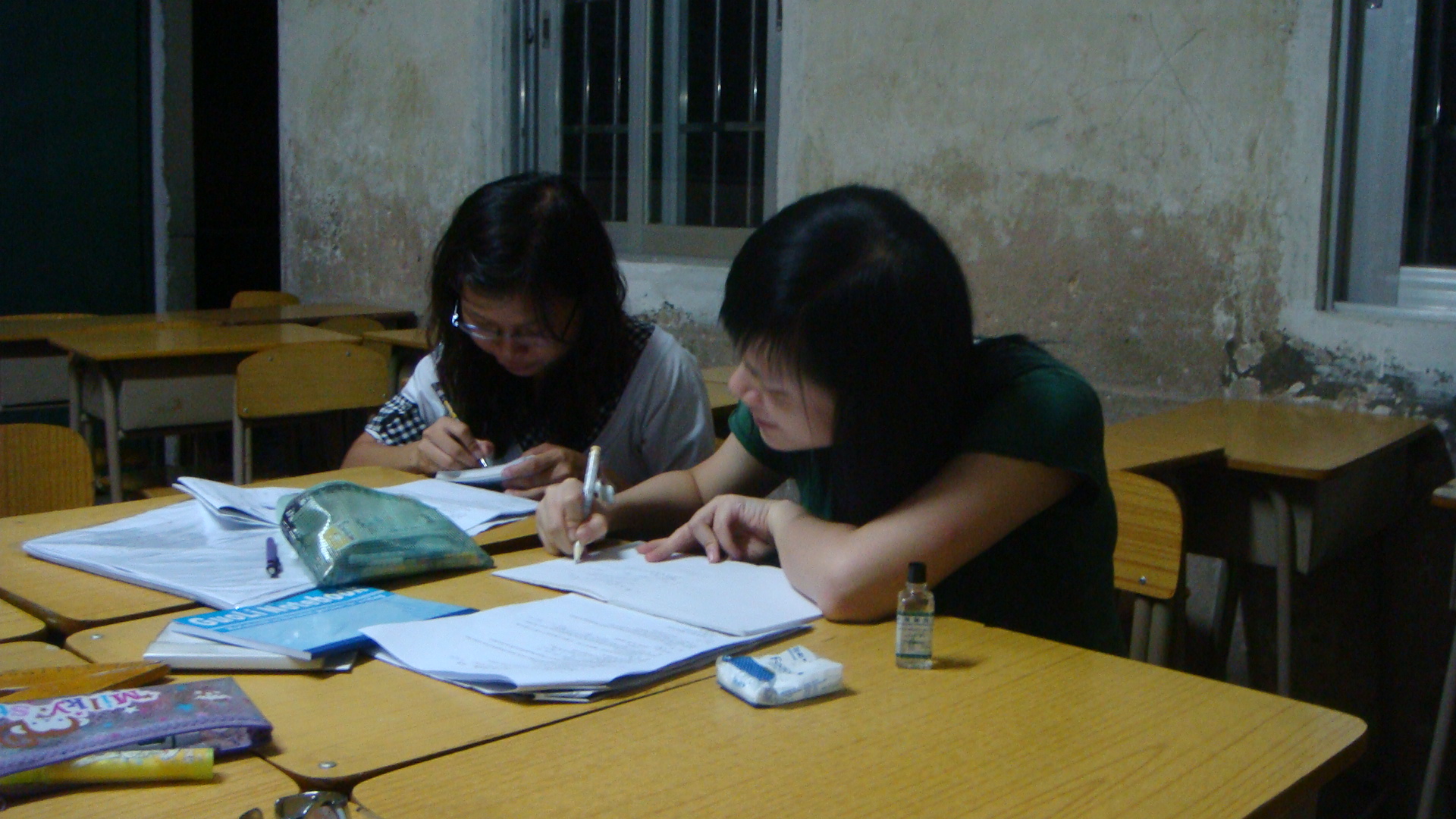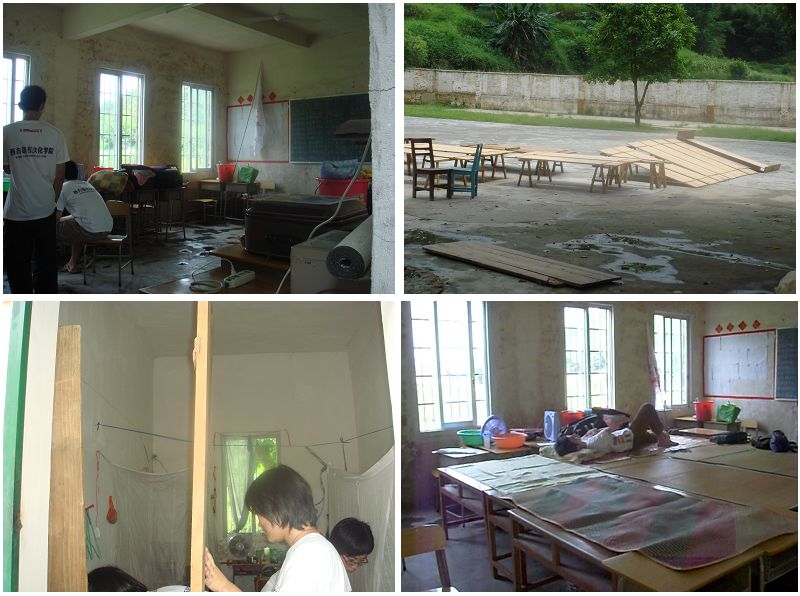 两个多小时后,服务队到达了四会市石狗镇讴坑村讴坑小学。大家马上展开了安顿工作:搬床板,抬桌椅,洗地板……一切都在热火朝天地进行着。原本用于六年级教学的教室,经过队员们的一番改造,变成了他们这十二天的“安乐窝”。