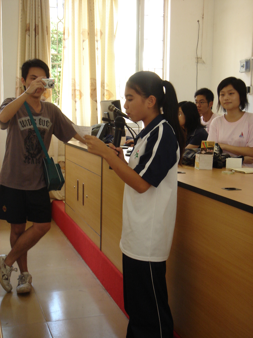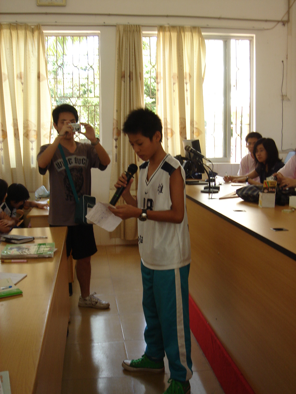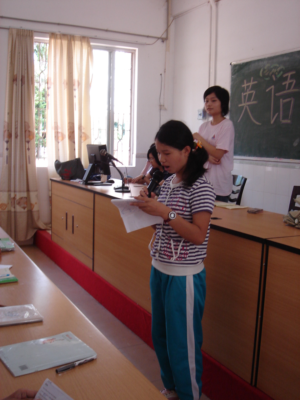 第九位上场的是平日一向沉默害羞的陈秋平同学。她开始有一点紧张,但是后来在队员陈潇潇眼神的鼓励下慢慢平静了下来,开始深情地朗诵。她的语音、语调都很标准,并得到了大家热烈的掌声。