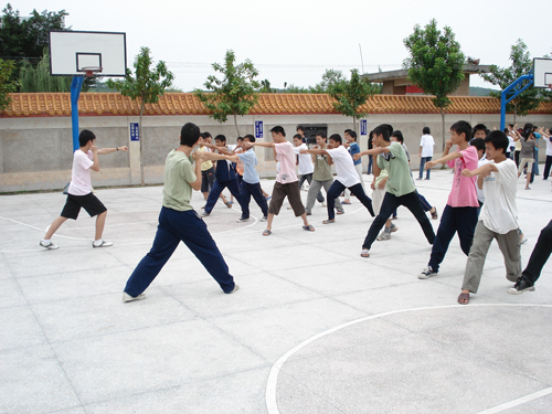 由于缺乏体育器材,体育组的老师另想他法——教授擒敌拳。操场上,孩子们跟着老师,“哼哼哈哈”地左一拳、右一拳,专心而认真。让队员们特别意外的是,很多女生也十分关注擒敌拳,全神贯注地学习老师的一招一式。