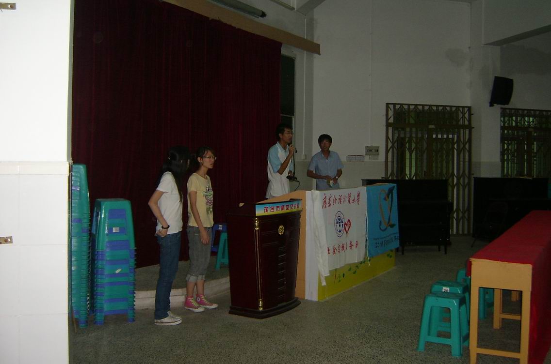 2008年7月15日早上八点,在新世纪学校阶梯室内,学校领导李校长、王主任,以及全体参加暑期学习的同学出席了江之情服务队社会实践义教的开学典礼大会。