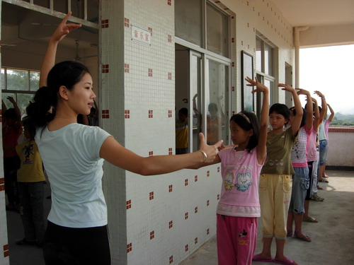 由于当地条件有限,没有专门的舞蹈室,队员们只好用腾出来的小课室作为舞蹈室。第一节课,五年级的50多个同学站满了整个课室,而走廊上也人头涌涌,很多其他小学的学生也在围观。为能照顾到所有同学,每节舞蹈课都配备了2名舞蹈老师。
