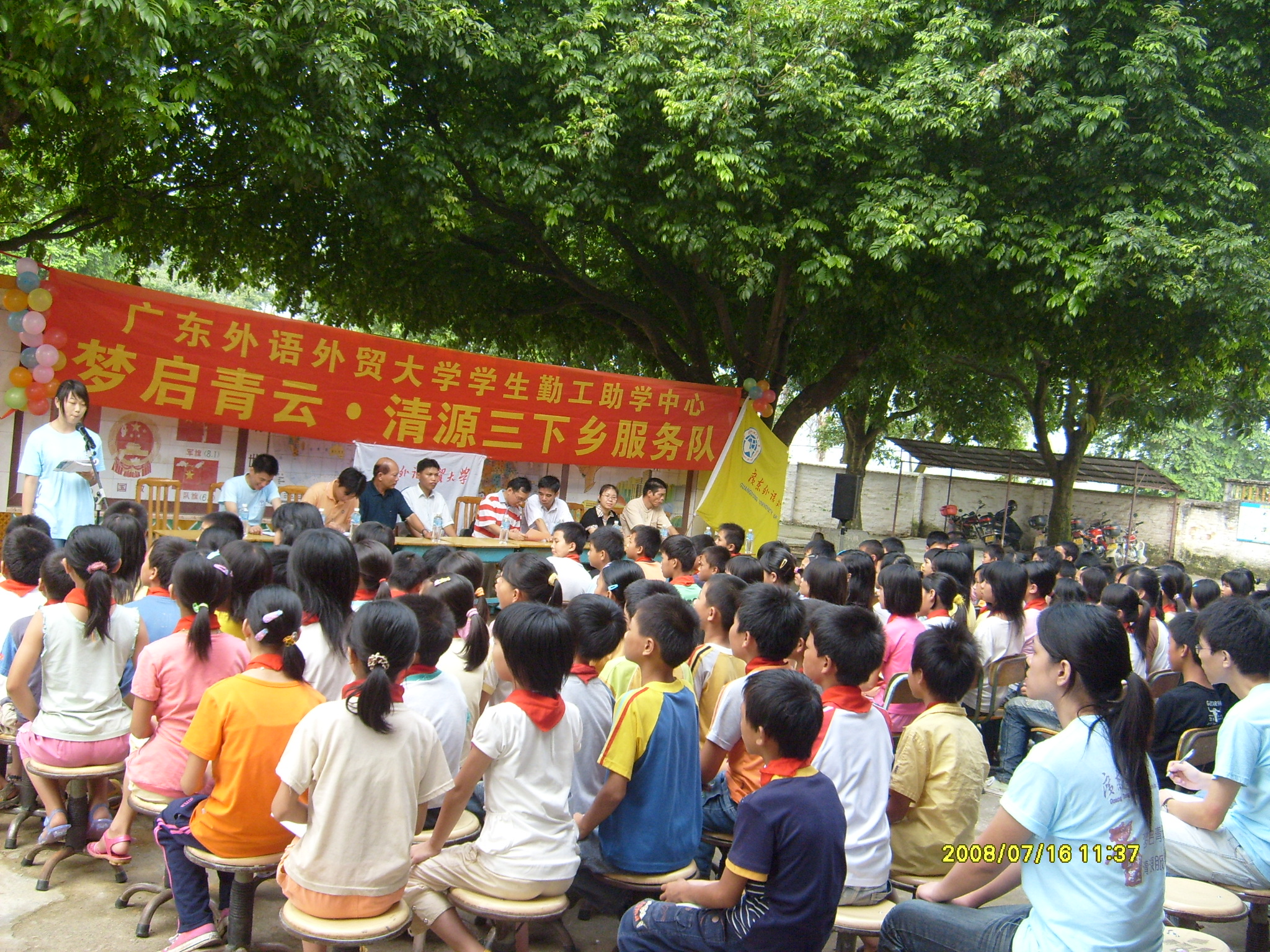 三下乡清源分队队长熊威珠主持了清源小学的开学典礼,总队长曾华华介绍广外大学生勤工助学中心党支部从2005年开始先后举办的三次暑期三下乡社会实践活动的情况,包括该活动获得校暑期三下乡活动队伍一、二等奖。同时承诺将会在本次三下乡活动中尽最大的努力取得最大的成果。