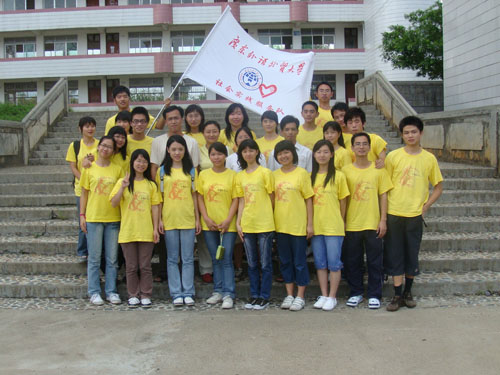 清晨,伴随着濛濛的雾气,“自强之心”服务队队员开始搬运行李物品。八点半左右,前往岭背的车轮开始移动,车内气氛十分活跃。很多队员之前都为八个小时左右的车程准备了很多有趣的节目,他们有的聚在一块玩小游戏,最特别的节目就是所有队员一起合唱队歌——《阳山的梦想》,歌词中不仅融入了队员们对下乡的渴望和喜悦之情,更突出了大学生激情高涨﹑热心服务社会的精神面貌。
