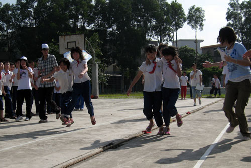 二人三足是一个很考验小朋友团队意识的运动。赛前,每队两位运动员各一条腿用两条带子捆绑在一起。起跑哨声响起后,运动员从起点跑向终点。这轮比赛设有5局,每个班都把跑得快的小朋友派了出来。当四局过后,两班以2:2打成平手,关键一刻还看最后一局。各班的啦啦队叫喊的声音也愈来愈大,最后B班以3:2的比分再次击败了A班。A班的老师不停地在为学生打气。老师说,A班的小朋友在投篮比赛中一定可以获胜,但是最重要的还是友谊第一、比赛第二。